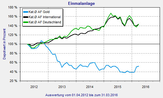 Einige Chancen nutzen konnte beispielsweise die Kategorie Aktienfonds International. Im ersten Quartal 2016 geht es ‚nur‘ 4,4 Prozent bergab. Allein im März holt die Kategorie bereits wieder 2,4 Prozent auf. Über drei Jahre erzielen Anleger im Schnitt ein Plus von 27 Prozent. So viel erreicht in diesem Zeitraum keine andere Kategorie. Edgar Walk, Chefvolkswirt bei Metzler Asset Management, schätzt zudem die Konjunkturperspektiven sowohl für die Eurozone als auch für die USA optimistisch ein. Auch Walter Liebe von Pictet Asset Management rät Anlegern dazu, nicht auf weitere große Kurskorrekturen zu wetten. Er beobachtet den Hang vieler Marktteilnehmer, den möglichst besten Zeitpunkt zu erwischen, um auszusteigen. „Diese Einstellung könnte sich für Viele rächen. Die USA und Europa werden sich in diesem Jahr gut entwickeln.“