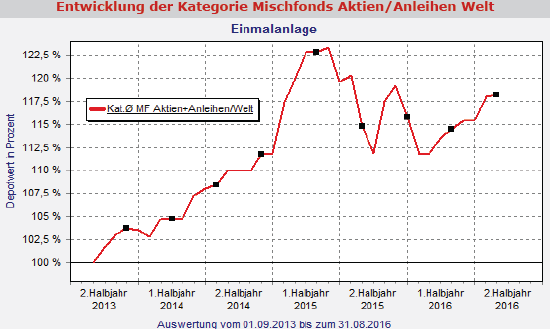 Über die vergangenen 30 Jahre hat die Kategorie Mischfonds Aktien und Anleihen/Welt, was die Performance im Durchschnitt betrifft ziemlich wechselhafte Zeiten hinter sich: So haben Fonds in dieser Kategorie im Schnitt 1996 bis 1998 mit 47 Prozent über den gesamten Zeitraum die höchste Rendite erzielt und zwischen 2002 und 2004 am stärksten abgegeben - mit einem Minus von 4,3 Prozent. Von 2014 bis zum 31. August 2016 lag die Rendite in der Kategorie durchschnittlich bei 14,2 Prozent – seit 2007 das beste 3-Jahres-Intervall.