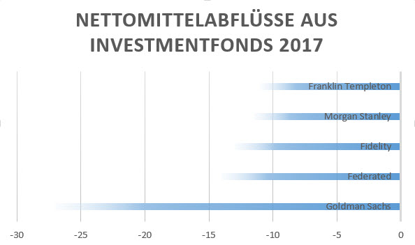 Die “Financial Times” kürt in ihrer aktuellen Ausgabe das Goldman Sachs Asset-Management zum größten Assetverlierer des Jahres 2017 weltweit. Die FT beruft sich dabei auf eine Datenerhebung des Researchhauses Morningstar. Demzufolge flossen aus den offenen Investmentfonds der Amerikaner seit Jahresbeginn knapp 27 Mrd. US-Dollar ab.