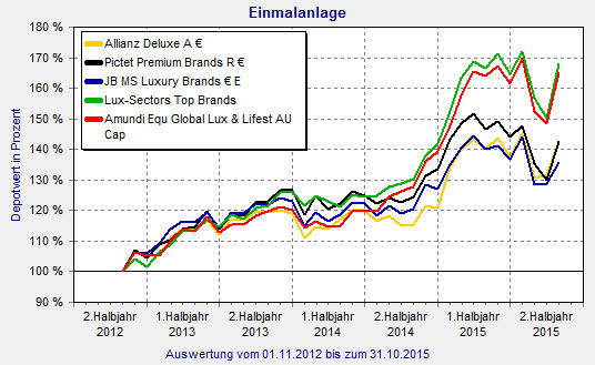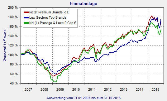 Diese Einschätzung spiegelt auch der World Luxury Index (ISIN: DE000A0LLPU8) wieder. Er bildet 20 der größten und liquidesten Unternehmen des weltweiten Luxusgütersektors ab. Seit Anfang des Jahres gewinnt er 8,6 Prozent hinzu. Auch Aktienfonds der Kategorie Luxus und Lifestyle des FINANZEN FundAnalyzers (FVBS) holen im laufenden Jahr kräftig auf und erzielen bisher ein Plus von 10,5 Prozent. In den vergangen sechs Monaten verzeichnet die Kategorie zwar einen Verlust von 2,6 Prozent, 2014 betrug das Wachstum jedoch nur sieben Prozent. An die zweistelligen Erträge aus 2013 (18,9 Prozent) und 2012 (20,8 Prozent) kann die Peergroup jedoch tatsächlich nicht mehr anschließen.