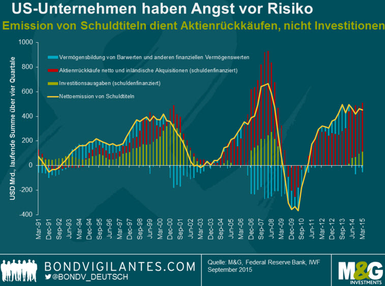 Seit der Finanzkrise sahen wir eine Schwemme an Unternehmensanleihen, da Firmen die niedrigen Zinsen für ihre begebenen Schuldverschreibungen nutzten. Was haben die Unternehmen aber mit all dem Cash gemacht, das ihnen die Kapitalmärkte geliehen haben? In überwältigender Zahl haben sie Aktien zurückgekauft und Fusionen und Akquisitionen finanziert, was teilweise für die Kurssteigerungen an den Aktienmärkten verantwortlich war. Nur ein kleiner Teil der Mittelzuflüsse von den Anleihenmärkten haben US-Unternehmen für Investitionsgüter verwendet, was auf eine anhaltende Risikoscheu hindeutet. Dies selbst in einem Umfeld, in dem die US-Wirtschaft laut vielen Beobachtern auch mit höheren Zinsen kein Problem hätte.