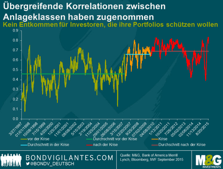 Es war einmal eine Zeit, da konnten sich die Anleger sicher sein, dass die Anleihen in ihrem Portfolio bei einem Aktienausverkauf eine gute Performance vorlegen würden und umgekehrt. Diese Zeiten sind vorbei. Analysen des IWF zeigen, dass sich Anlageklassen zunehmend in dieselbe Richtung bewegen. In anderen Worten: Die berühmte Regel des Investierens namens Diversifikation hat nicht mehr dieselbe Bedeutung wie in der Vergangenheit. Besorgniserregend ist, dass die Tendenz der sich gemeinsam in eine Richtung bewegenden Anlagepreisen nie ausgeprägter war. Die Korrelationen waren selbst zu Zeiten mit niedriger Volatilität auf einem hohen Niveau. Eine große Krise an den Anlagemärkten könnte die Zerbrechlichkeit des Finanzsystems auf eine harte Probe stellen, sollten die Bewertungen von Anlagewerten auf breiter Front stark nachgeben.