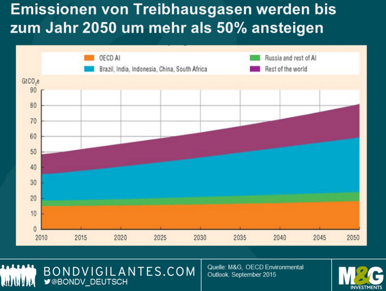 Letztlich die furchterregendste Chart von allen. Die weltweiten Treibhausgasemissionen nehmen weiterhin zu und erhöhen stetig den Druck auf die Umwelt. Die OECD schätzt, dass Treibhausgasemissionen, angetrieben von einer Zunahme der Kohlendioxidemissionen um 70%, bis zum Jahr 2050 um mehr als 50% zunehmen werden. Bis zum Jahr 2050 wird ein Anstieg im Energiebedarf von 80% erwartet. Sollte sich diese Prognose als zutreffend erweisen, dürften die globalen Temperaturen um 3-6°C steigen. Niederschlagsmuster werden sich ändern, Gletscher schmelzen, der Meeresspiegel ansteigen und extreme Wetterbedingungen in bisher unbekannter Form zunehmen. Die potenziell dramatischen Umweltveränderungen könnten katastrophale und unumkehrbare Folgen für die Umwelt und die Gesellschaft haben.