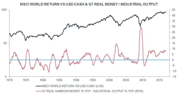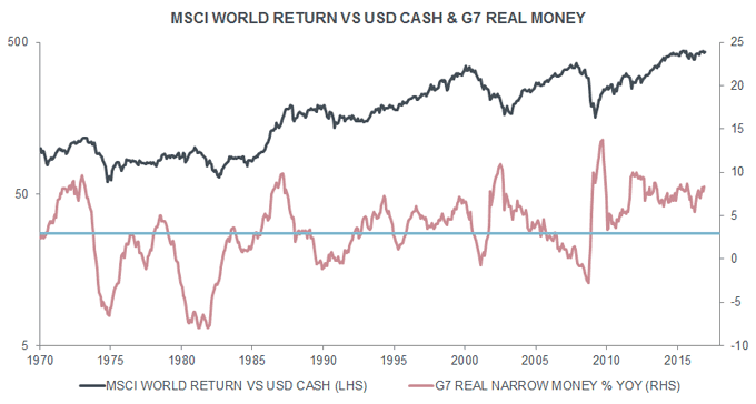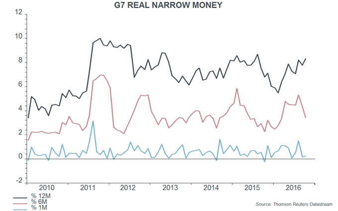Simple “monetarist” rules for switching between global equities and cash continue to favour equities at present. A fall in G7 real narrow money growth, however, could trigger a “sell” signal during the first half of 2017.