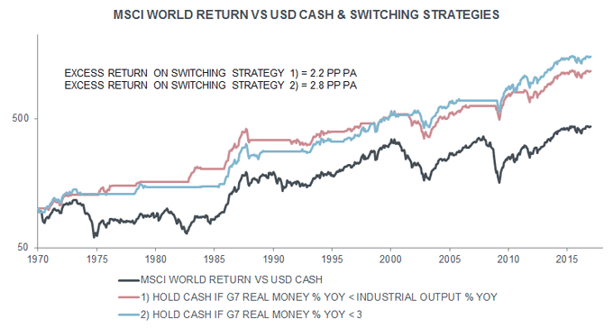 The second, simpler rule holds equities if G7 annual real narrow money growth is above its long-run average of 3% (after rounding**). Global equities returned 10.6% per annum (pa) more than cash on average between 1970 and 2015 when real money growth was above 3%. They underperformed cash by 6.2% pa when real money growth was below 3% – second chart.