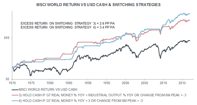 The third chart compares the performance of these switching rules with the return on equities relative to cash (i.e. buy and hold). Global equities outperformed US dollar cash by 3.1% pa on average over 1970-2015. The first switching rule, based on the real money / output growth differential, beat cash by 5.4% pa over this period, implying an excess return of 2.2 percentage points (pp, after rounding). The second rule outperformed by 6.0% pa, implying a 2.8 pp excess return.
