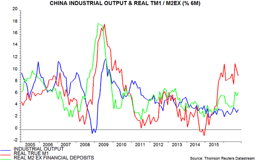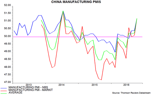 The second chart shows six-month changes in industrial output and the money measures expressed in real terms (i.e. deflated by consumer prices). Industrial output growth has picked up by less than was expected here on the basis of real money trends, partly reflecting economic “rebalancing” away from heavy industry. Strong October manufacturing PMIs, however, suggest that momentum will rise in late 2016 – third chart.