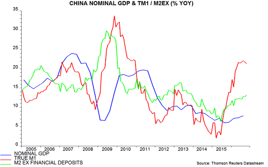 Rising growth of the two money measures since mid-2015 has been reflected in a pick-up in annual nominal GDP expansion in 2016. This pick-up should continue into early 2017, even assuming that annual true M1 growth peaked in August – the lead from money to nominal GDP expansion has been at least six months in recent years.