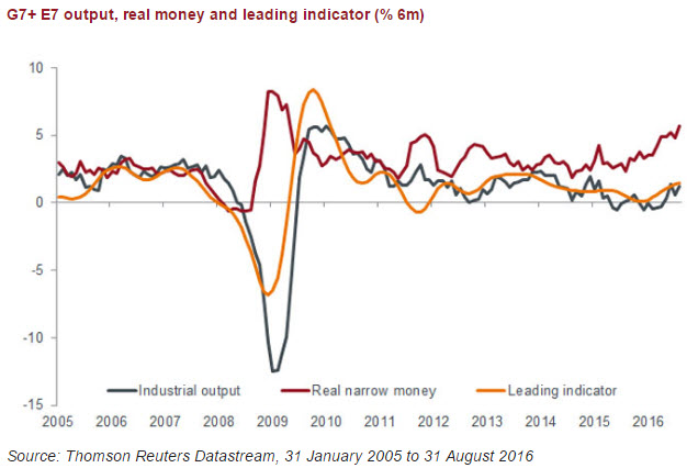 The positive signal from monetary trends was confirmed in early 2016 by an upturn in a non-monetary G7 plus E7 leading indicator that combined a range of forward-looking economic and financial series. The indicator has continued to firm in recent months, while real money growth has reached its highest level since 2009. Global growth could be much stronger than the consensus expects in 2017.