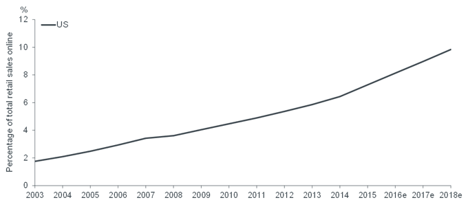 Source: Retail Indicators Branch, US Census Bureau, Citi Reserach estimates, as at 17 November 2016. E-commerce sales = online sales.