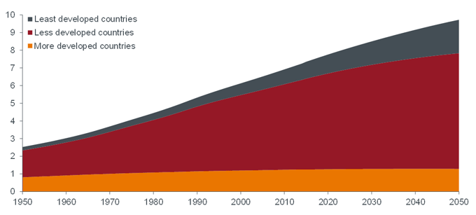 Yes, approximately 12% of the portfolio* is currently allocated to emerging markets. We see ourselves as global investors, unconstrained by geographic boundaries and believe the long-term opportunity being created by rising living standards in some parts of the developing world is a very powerful one. To put it into perspective, population growth will almost entirely come from the least and less developed countries in the years ahead (see chart below) and half of the world’s workers are expected to live in Asia and Africa by 2050. We benefit in this regard by working closely with Henderson’s Global Emerging Market Equities Team, also based in our Edinburgh office, with whom we share a long-term investment time horizon and overlapping investment universe.