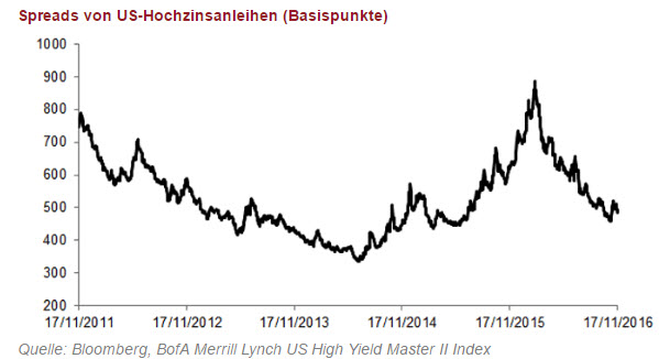 Weil Trump reflationäre Töne anschlägt, geht der Markt von mehr Inflationsdruck aus. Das deuten die in den letzten Tagen gestiegenen Renditen von US-Staatsanleihen an. Dabei war es erfreulich zu sehen, wie die Spreads von Hochzinsanleihen einen Teil dieses Anstiegs lehrbuchhaft absorbiert haben. Beim Taper Tantrum 2013 weiteten sich die Spreads jedoch mit Verzögerung. Später kehrte sich dieser Trend zwar wieder um, dennoch kam es kurzzeitig zu einem Kursrückgang bei Hochzinsanleihen.