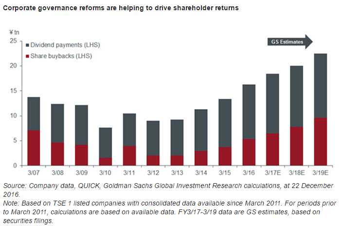 A: I think there are three main drivers in the medium term: Reacceleration of corporate earnings growth Overall, Japanese equities’ performance was disappointing in 2016 as earnings momentum slowed following strong growth over the last three years. The main reason for this was the strong yen. Now that the currency has relatively stabilised, we think Japanese companies’ earnings growth is set to reaccelerate and therefore Japanese stocks look to be in a strong position to outperform other developed equity markets this year. Strong support for Japanese equities In 2016 the largest buyers of Japanese stocks were state entities like the Bank of Japan and GPIF (Government Pension Investment Fund), as well as Japanese corporations mainly via share buybacks. This is likely to continue into 2017 providing strong support to the market. The GPIF doubled its equity allocation since 2014 and now owns more than 5% of the Japanese equity market according to Bloomberg. Foreign investors were net sellers of Japanese stocks last year but should earnings growth return this position is likely to reverse.