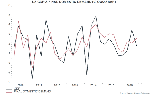GDP growth fell to 1.9% annualised in the fourth quarter of 2016 from 3.5% in the third, reflecting a normalisation of agricultural exports after a temporary surge. Growth of final domestic sales strengthened between the two quarters, from 2.1% to 2.7% – see first chart.