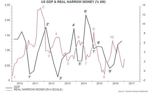 The US economy picked up speed in the second half of 2016 and has started 2017 strongly. This acceleration was predicted by monetary trends, which now suggest a slowdown over the spring and summer. The slowdown may be modest and temporary, partly reflecting the current positive status of the Kitchin stockbuilding and Juglar business investment cycles. It may, however, constrain the Federal Reserve’s rate-hiking plans.