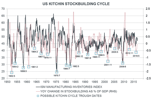 Kitchin cycle upswings usually last for at least 18 months. A mid-2016 trough would imply that the cycle will continue to provide a tailwind to the economy through end-2017.