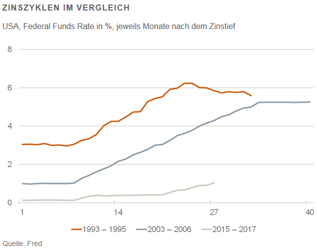 Die erste Phase war der Zinsanstieg Anfang der 90er Jahre. Damals erhöhte die Federal Reserve die Zinsen in gut eineinhalb Jahren von 3 % auf 6 %. Das war eine Rosskur für Wirtschaft und Finanzmärkte. Sie führte zu erheblichen Turbulenzen. Heute würden wir sagen, das war nicht gut.