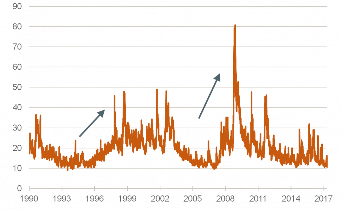 Eine ist, dass das absolute Niveau des Indexes gegenwärtig sehr niedrig ist. Derzeit befinden wir uns fast am tiefsten Punkt der letzten 27 Jahre. Das mag vielleicht im Hinblick auf die gute wirtschaftliche Situation gerechtfertigt sein, nicht aber, wenn man die großen politischen Risiken in der Welt berücksichtigt. Allein im Durchschnitt der Jahre 2015/2016 war die Volatilität fast 50 % höher. Das passt nicht. Wir müssen daher davon ausgehen, dass der VIX wieder steigt. Das bedeutet, dass es bei den Aktienkursen tendenziell zu Rückschlägen kommt.
