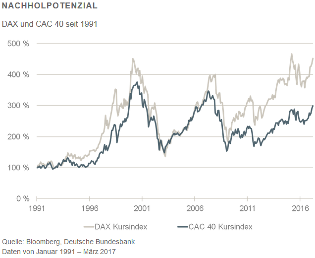 Im Augenblick ist die Situation in Frankreich noch schwer einzuschätzen. Wenn sich das Pendel aber in Richtung Reformen bewegen sollte, dann wird das auch für Anleger interessant. Der CAC 40 spiegelt die Lage der Wirtschaft gut wider. Er hat bis zur Finanzkrise 2007/2008 gut mit dem DAX mitgehalten. Seitdem ist er zurückgefallen (siehe Grafik). Er notiert heute weit unter den historischen Höchstständen. Er hat damit viel Potenzial nach oben. Der CAC 40 enthält eine Reihe von interessanten Werten. Wenn es an der Pariser Börse wieder aufwärtsgehen sollte, wird davon auch der EURO STOXX 50® profitieren.