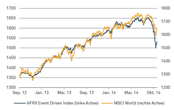 Dass Hedgefondsstrategien generell und auch Hedgefondsstrategien im UCITS-Mantel nicht zwangsläufig ins gelobte Land führen, haben wir an dieser Stelle schon mehrmals kritisch angemerkt (Finger weg von Hedgefonds-Strategien? und „Alternative UCITS“: Wunderdinge sind nicht zu erwarten). Die Kritik, dass viele Strategien bestenfalls „Beta“ bieten, sich aber „Alpha“ bezahlen lassen, ist definitiv nicht von der Hand zu erweisen. Dies gilt natürlich auch für das Segment Event Driven, wie folgender Chart verdeutlicht: