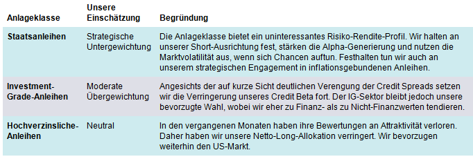 Die Spreads von IG-Anleihen in USD und Pfund Sterling entwickelten sich weiterhin gut, diejenigen der auf Euro lautenden Bonds weiteten sich jedoch aus. Der Hochzinsbereich bot hingegen die beste Performance und übertraf alle anderen festverzinslichen Anlageklassen. Wir erwarten nach wie vor ein schwieriges Umfeld für Staatsanleihen in der ersten Jahreshälfte. Sie sind zwar günstiger geworden, aber noch nicht attraktiv bewertet, und auch die technischen Rahmenbedingungen bieten zunehmend weniger Unterstützung. Im Gegensatz dazu sollte die Verengung der Credit Spreads anhalten. Sie dürften von einem ausgewogeneren Politikmix (Fiskalpolitik wird die Geldpolitik nun eher ergänzen als bremsen), einem gesünderen Nominalwachstum und steigenden Gewinnen profitieren.