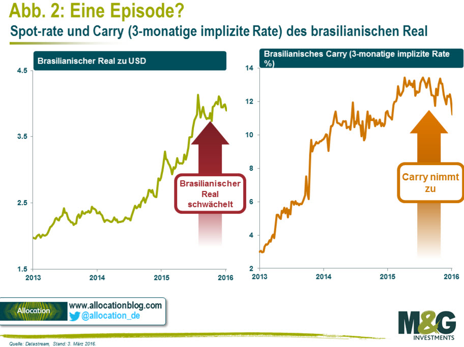 Zu Beginn des Jahres 2016 zeigte der brasilianische Real denn auch die Symptome eines anstehenden „Carry Trade“: traumatische Spot-Kurse mit erhöhtem Carry. Die Fundamentaldaten verschlechterten sich rapide für Brasilien, doch war es zweifelsohne der Fall, dass die Kurse extrem negative Prognosen für die brasilianische Wirtschaft einpreisten, die für positive Überraschungen jede Menge Spielraum ließen.