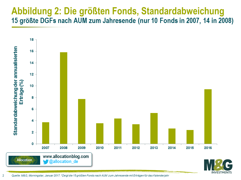Die Dispersion ist in 2016 definitiv weiter als zu jedem anderen Zeitpunkt seit 2008 war, was sich auch in der Standardabweichung der Erträge für jedes Jahr ablesen lässt.