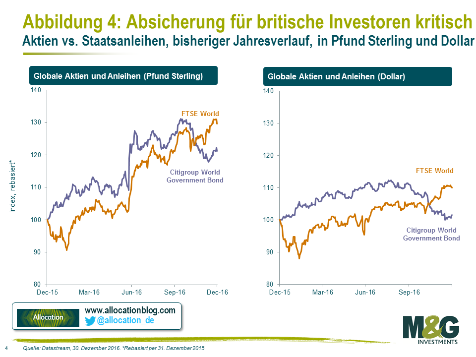 Die allgemeine Meinung ist heutzutage, dass die Fonds mit guter Wertentwicklung in 2016 solche waren, die ihre Auslandsanlagen nicht gesichert haben (egal ob dies standardmäßig erfolgte oder es sich um eine aktive Anlageentscheidung handelte). Die folgende Zahlen zeigen, dass nicht Hedging (links) zu höheren Erträgen und einer höhere Korrelation zwischen globalen Aktien und globalen Anleihen geführt hat.