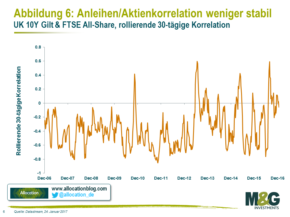 Das Ergebnis war eine geänderte Markteinstellung gegenüber Risiko. In einer Welt mit einer anscheinend „säkularen Stagnation“ könnten Staatsanleihen weiter ihrer Rolle als ein sicherer Hafen gerecht werden. Heutzutage ist es jedoch erheblich einfacher, sich Szenarios vorzustellen, die für Anleihen negativ sind oder die Anleihen und Aktien gleichermaßen schädigen. In der Folge kam es zu einer anhaltenden Instabilität der Korrelationsmuster.
