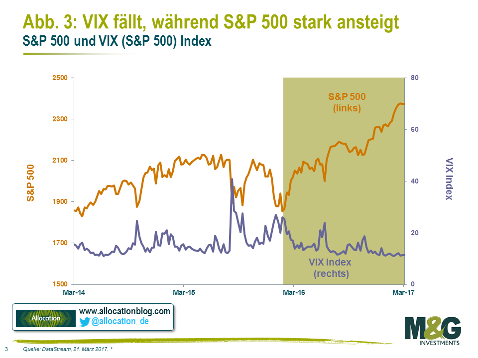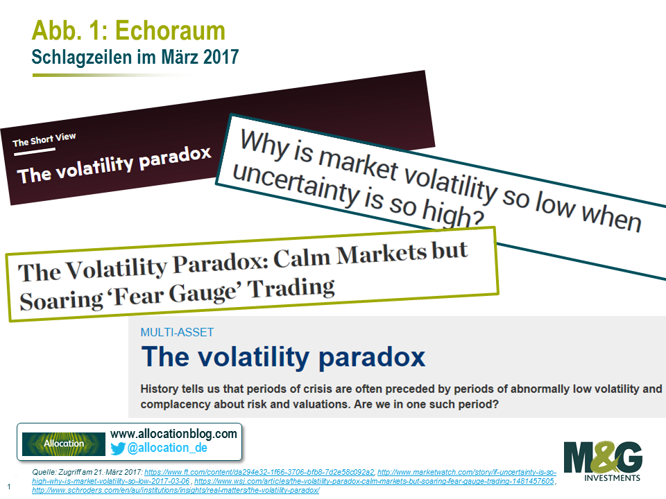 Finanzkommentatoren und Journalisten – für Herdenbildung ebenso anfällig wie die Anleger selbst – haben auf das „Volatilitätsparadoxon“ aufmerksam gemacht, den offensichtlich fehlenden Zusammenhang zwischen einer niedrigen Volatilität an den Aktienmärkten und einem verstärkt unsicheren makroökonomischen Umfeld.