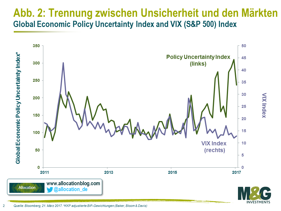 Für dieses Szenario bedarf es einer mehr asymmetrischen Verschiebung der Sichtweisen mit einer größeren Zahl an Investoren, die zur Zahlung höherer Preise bereit sind. Wir hatten früher bereits dazu geschrieben und argumentiert, dass dies teilweise damit im Zusammenhang steht, dass der zu Anfang des letzten Jahres vorherrschende Pessimismus verschwunden ist. Die im Moment existierende geldpolitische Unsicherheit ist teilweise durch die Möglichkeit einer US-amerikanischen oder globalen „Reflation“ charakterisiert. Es mag zwar nicht das Basisszenario vieler Marktteilnehmer sein, doch gehörte diese Konstellation vor einem Jahr nicht einmal zu den Wahrscheinlichkeitsverteilungen.