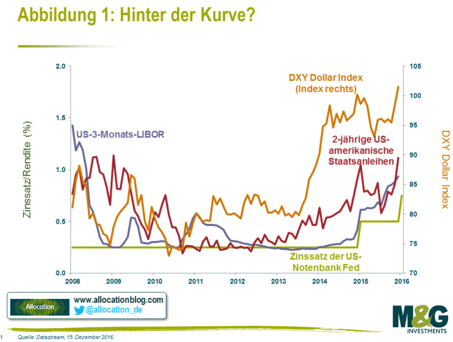Vor dem Hintergrund des Ausgangsniveaus der Zinsen, der relativen Unempfindlichkeit der Ausgaben gegenüber dem Leitzins der US-Notenbank sowie der prozyklischen politischen Intentionen der neuen US-Regierung könnten die Zinsen wesentlich stärker steigen, als es derzeit vom Offenmarktausschuss angenommen wird.