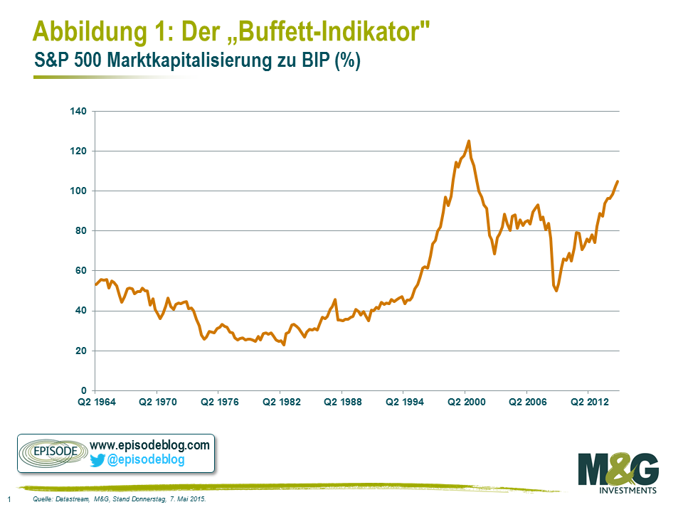 In der letzten Zeit sehen wir einiges Interesse an der Marktkapitalisierung der USA als Prozentsatz des BIP – eine Kennzahl, die viele Leute als „Buffett-Indikator” bezeichnen. Tatsächlich erscheint die Marktkapitalisierung des S&P 500 als Teil des BIP heutzutage als erhöht (siehe Abbildung).
