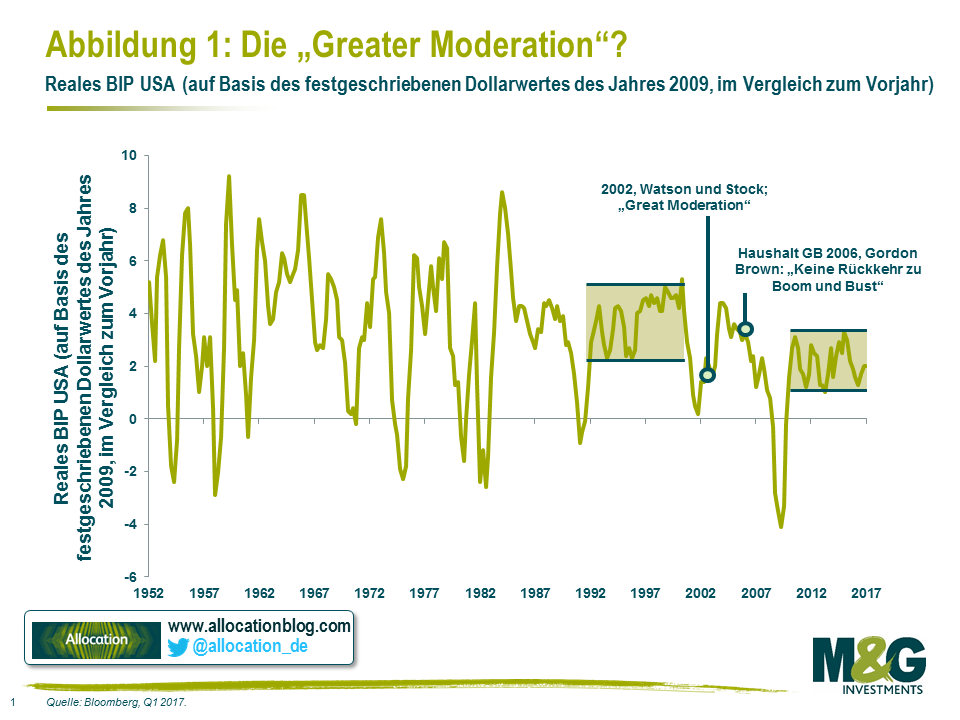 Das Definitionsmerkmal amerikanischer Wirtschaftsdaten seit der Finanzkrise ist nicht Stagnation, sondern Stabilität. Mit Ungläubigkeit bezüglich der Selbstüberschätzung von Wirtschaftswissenschaftlern blicken wir alle zurück auf die „Great Moderation“. Oder ist die Große Moderation vielleicht zur Realität geworden?