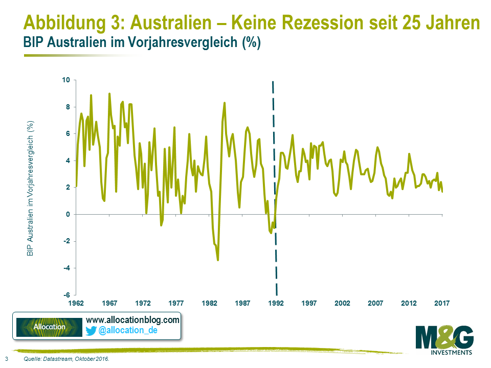 Australien hat seit 25 Jahren keine Rezession erlebt (und bevor nun das Wort „China“ fällt, sollte man sich in Erinnerung rufen, dass Australien resistent gegenüber der Asienkrise, der globalen Finanzkrise sowie dem Boom-Bust-Zyklus im Rohstoffsektor war, obwohl das Land während der gesamten Zeit mitunter die höchste Verschuldung der privaten Haushalte aufwies!)