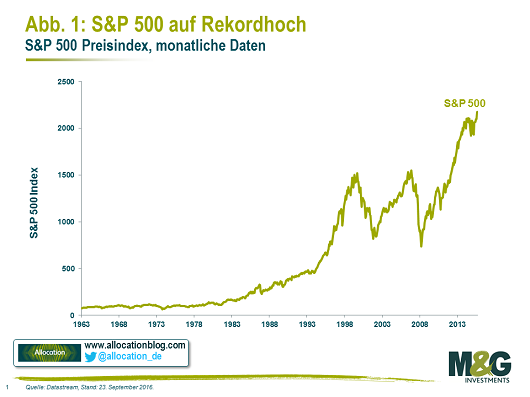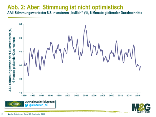 Was ist es also, das unsere kollektive Stimmungslage beeinflusst und unseren kollektiven Optimismus dämpft? Eine definitive Antwort ist unmöglich. Es kann allerdings durchaus der Fall sein, dass eine negative Akzentuierung in den Medien in Kombination mit erschütternden Bildern aus regionalen Konflikten wenig hilfreich für unsere eh schon anfällige Gefühlslage ist, die das Trauma der in den letzten Jahren immer wederkehrenden Volatilität noch nicht überwunden hat. Behalten wir dies im Hinterkopf und kehren wir nun zu den US-Aktienkursen – nahe Rekordniveau trotz weitverbreitetem Pessimismus – zurück.