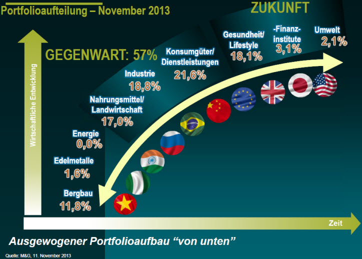 Im Mittelpunkt der Strategie steht eine Kurve, die abbildet wie sich im Laufe der Zeit das Konsumverhalten und die Bedürfnisse der Bevölkerung in den Schwellenländern ändert und damit bestimmte Sektoren für das jeweilige Land an Bedeutung gewinnen. Länder am unteren Ende der Kurve bauen Häuser, Schulen, Straßen und Krankenhäuser. Dementsprechend war der M&G Global Basics Fund in den ersten Jahren stark in die Branchen Bergbau, Edelmetalle und Energie investiert. Dieser Schwerpunkt hat sich mittlerweile hin zu Nahrungsmittel/Landwirtschaft, Industrie und Konsumgüter/Dienstleistungen verschoben. Allerdings ist dieses Konzept kein statischer Prozess. Somel hat die Flexibilität auf der Kurve nach oben und unten zu rücken, je nachdem wo er die attraktivsten Bewertungen sieht. Beispielsweise hat er kürzlich in den Rohstoffkonzern BHP Billiton investiert.