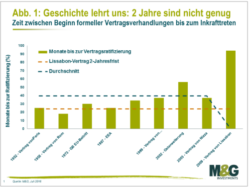 Der Vertrag von Lissabon spricht von einer „Sunset Period“, d.h. einem Zeitraum von zwei Jahren, während denen ein EU-Austritt verhandelt werden muss. Die jüngste Geschichte deutet allerdings an, dass EU-Vertragsverhandlungen meist deutlich mehr Zeit in Anspruch nehmen. Tatsächlich haben sie alle mit Ausnahme von einem Vertrag länger als 24 Monate gedauert