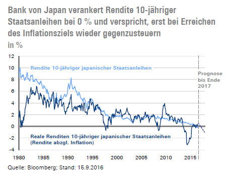 Bank von Japan verankert Rendite 10-jähriger Staatsanleihen bei 0 % und verspricht, erst bei Erreichen des Inflationsziels wieder gegenzusteuern in % Quelle: Bloomberg; Stand: 15.9.2016