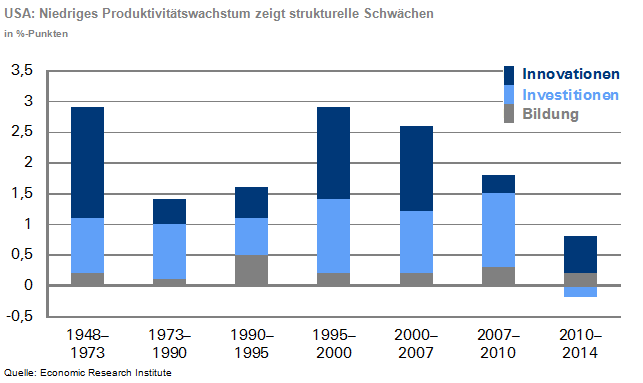 Langfristig basiert aller Wohlstand einer Volkswirtschaft ohne Rohstoffvorkommen auf der Produktivität. Sie kann durch Innovationen, eine bessere Bildung oder Investitionen gesteigert werden. Ein Blick auf die Entwicklung der Produktivität in den USA zeigt, dass die staatlichen und privaten Investitionen etwa 0,9 %-Punkte pro Jahr zum Produktivitätswachstum in der Zeit seit dem Zweiten Weltkrieg bis zur Finanzmarktkrise beitrugen, während die Innovationen sogar 1,2 %-Punkte lieferten. Der Beitrag der Bildung war relativ stabil bei 0,2 %-Punkten, wie eine empirische Analyse des Economic Cycle Research Institutes zeigt (Durchschnitt der ersten sechs Balken in der folgenden Grafik).