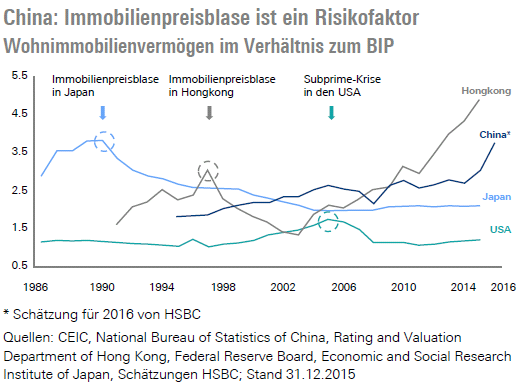 Wahrscheinlich wird die derzeit einsetzende Konjunkturerholung in China 2017 für sukzessiv steigende Inflationsraten sorgen, was eine Straffung der Geldpolitik zur Folge haben dürfte. Darüber hinaus ergreift die chinesische Regierung zunehmend Maßnahmen, um die Dynamik am Wohnimmobilienmarkt zu bremsen. So erschwerte die Regionalregierung in Shanghai in dieser Woche den Zugang zu Krediten für Bauunternehmen erheblich. Eine restriktivere Geldpolitik in Kombinaten mit regulatorischen Maßnahmen könnte ab 2018 wieder zu fallenden Immobilienpreisen führen. In diesem Falle wäre es wichtig, dass die chinesische Regierung den Konkurs zahlreicher Bauunternehmen zulässt und die Banken zu schnellen Abschreibungen der dadurch entstandenen notleidenden Kredite zwingt, sodass "nur" eine konjunkturelle Schwächephase eintritt und China nicht mit einer verlorenen Dekade zu kämpfen hat.