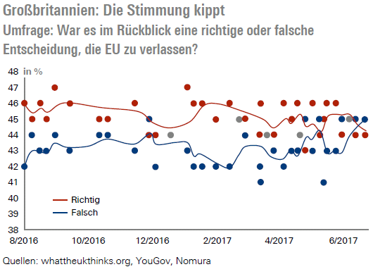 Großbritannien scheint aus dem globalen Zug des Konjunkturaufschwungs herausgefallen zu sein. Die Konjunkturdaten in dieser Woche fielen eher schwach aus. Die schwierige Konjunktur in Kombination mit steigenden Konsumentenpreisen scheint ein gewisses Umdenken im Hinblick auf die Brexit-Entscheidung bei der britischen Bevölkerung bewirkt zu haben, wie letzte Umfragen zeigen: