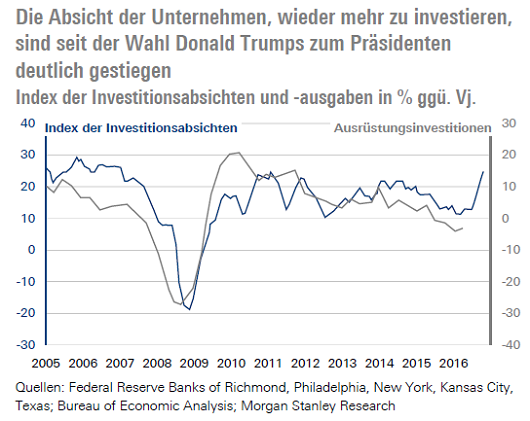Ein Grund für die plötzliche Verbesserung der Stimmung in den Unternehmen und die gestiegenen Investitionsabsichten könnte die Wahl Donald Trumps zum US-Präsidenten sein – mit den Versprechen, die Steuern zu reformieren, den Markt zu deregulieren und die Infrastrukturausgaben zu erhöhen. Dabei ist es für die Unternehmen aufgrund der Langfristigkeit der Investitionen nicht entscheidend, wann die angekündigten Schritte umgesetzt werden, sondern ob überhaupt. Sollte die Gesundheitsreform scheitern, könnte dies das Vertrauen in weitere Maßnahmen erschüttern und den Konjunkturaufschwung in Gefahr bringen. Es ist bisher jedoch nur ein Risikoszenario, da der Investitionsaufschwung die Weltwirtschaft erreicht hat und offenbar eine positive Eigendynamik auf globaler Ebene entstanden ist.