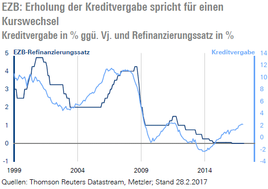 In der Eurozone fällt es dagegen schwer, einen guten Grund für die aktuelle Ausrichtung der Geldpolitik zu finden. So konnte sich die Kreditvergabe merklich erholen, was eigentlich schon jetzt für ein Ende des QE-Programms sprechen würde.