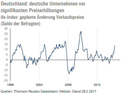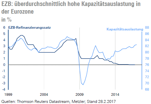 Darüber hinaus ist die Kapazitätsauslastung in der Industrie in der Eurozone wieder auf ein überdurchschnittlich hohes Niveau gestiegen. Zu Beginn des ersten Quartals 2017 lag die Kapazitätsauslastung bei 82,5 % – ein Wert, der zuletzt im dritten Quartal 2008 bei einem Leitzinsniveau von 4,25 % erreicht wurde. Die guten Konjunkturdaten wie Konsumentenvertrauen (Donnerstag) und Einkaufsmanagerindizes (Freitag) sprechen zudem dafür, dass die Kapazitätsauslastung in den kommenden Quartalen weiter steigen wird. Es reicht schon ein Wachstum der Industrieproduktion von mehr als 1,2 %, um einen Anstieg der Kapazitätsauslastung zu bewirken. Im vergangenen Jahr wuchs die Industrieproduktion um 1,4 % und in diesem Jahr wird mit einem Wachstum von 1,7 % gerechnet.