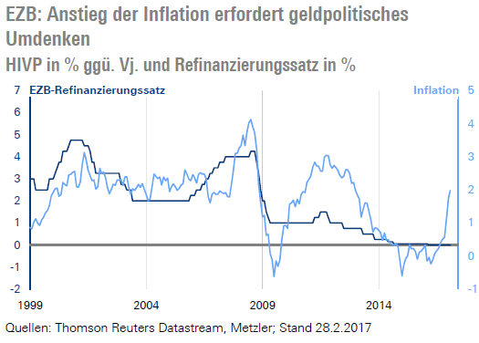 Auch die Inflation ist kein Grund mehr für die extrem lockere Ausrichtung der Geldpolitik. Selbst die EZB rechnet mit einer Inflationsrate von 1,7 % in diesem Jahr, nachdem die Inflation in den vergangenen drei Jahren überwiegend im negativen Bereich verharrte.