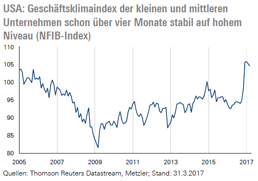 Nichtsdestotrotz gab es in der Vergangenheit immer wieder Phasen, in denen unrealistisch hohe Erwartungen entstanden und über einen kurzen Zeitraum Fehlsignale lieferten. Vergangene Erfahrungen legen jedoch Nahe, dass, je länger sich die Umfragewerte auf hohen Niveaus halten, die Wahrscheinlichkeit umso höher ist, dass sie die tatsächliche wirtschaftliche Aktivität abbilden. In den USA sprang beispielsweise der Geschäftsklimaindex der kleinen und mittleren Unternehmen nach der Wahl Donald Trump auf ein sehr hohes Niveau und kann sich dort schon seit vier Monaten in Folge halten.