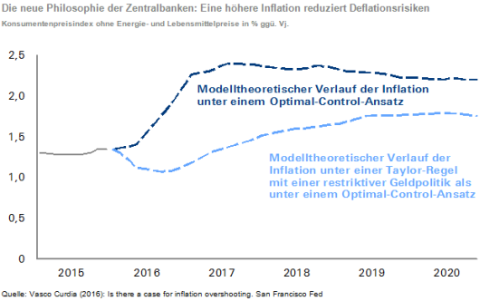 Bisher reagierten die Zentralbanken auf steigende Inflationsraten mit einer Straffung der Geldpolitik, um schon früh ein Überschießen der Inflation über das Inflationsziel zu verhindern. Die Taylor-Regel spiegelt beispielsweise dieses Verständnis der Geldpolitik in einer mathematischen Formel wider. In letzter Zeit mehren sich jedoch die Stimmen, die eine deutlich expansivere Geldpolitik als unter dem alten Paradigma und temporär höhere Inflationsraten befürworten. Der Hintergrund dafür ist die steigende Deflationsangst, die damit verbunden ist, dass die Geldpolitik kaum noch signifikante Impulse liefern kann und die Inflationsraten nach wie vor niedrig sind. Dieses neue Verständnis von Zentralbankpolitik kommt aus den USA und wird als Optimal Control Theory bezeichnet, beispielsweise kürzlich in einer Studie der San Francisco Fed.