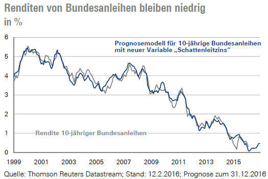 Verwendet man den Schattenleitzins als Indikator für die unorthodoxen Maßnahmen der Zentralbanken in einem traditionellen Prognosemodell für die Rendite 10-jähriger Bundesanleihen, lässt sich die Renditeentwicklung in den vergangenen Monaten erstaunlich gut erklären.