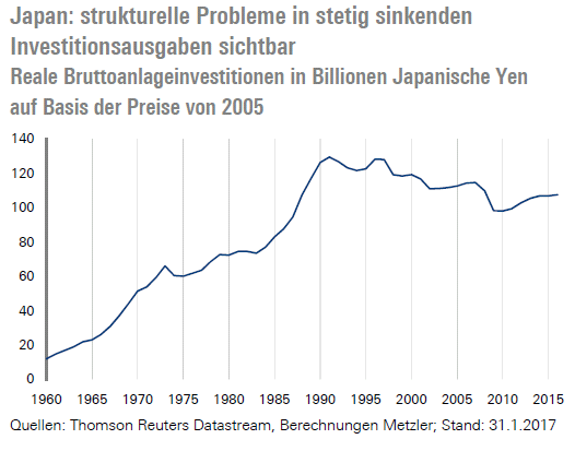 Die Gründe der Wachstumsschwäche der Weltwirtschaft werden derzeit intensiv diskutiert. So wird argumentiert, dass Kredite aufgrund der hohen Verschuldung nicht nachgefragt werden und Banken aufgrund der Altlasten in ihren Bilanzen keine Kredite mehr vergeben können. Jeder geld- oder fiskalpolitische Stimulus verpufft in diesem Umfeld schon nach kurzer Zeit, wie die Erfahrung Japans seit Anfang der 1990er Jahre gezeigt hat. Die zahlreichen Stimulusmaßnahmen haben nur einen kontinuierlichen Anstieg der Staatsverschuldung bewirkt, ohne die Deflation nachhaltig zu überwinden. Die strukturellen Probleme Japans - fehlende Kreditnachfrage und eingeschränktes Kreditangebots - sind ablesbar an der Entwicklung der realen Bruttoanlageinvestitionen, die seit dem Erreichen des Hochpunkts im Jahr 1991 kontinuierlich gefallen sind. Japanische Unternehmen waren überschuldet und zahlten daher eher Kredite ab, als neue nachzufragen. Auch konnten die de facto lange Zeit insolventen japanischen Banken keine neuen Unternehmen finanzieren.